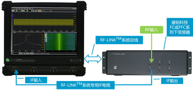 當SAS系列采用RF-Link智能下變頻系統技術與盛鉑科技FC和FFC系列下變頻器進行系統集成時,將會變身為一個射頻微波信號采集存儲分析系統。整個RF-Link的系統搭建過程十分簡單也很智能,系統搭建完畢后SAS系列將會自動獲得FC或FFC系列下變頻產品的具體型號和所有變頻相關參數,并取得對整個系統的控制權,此后無需再獨立操作外部下變頻產品即可獲得很好的系統參數的匹配方式。