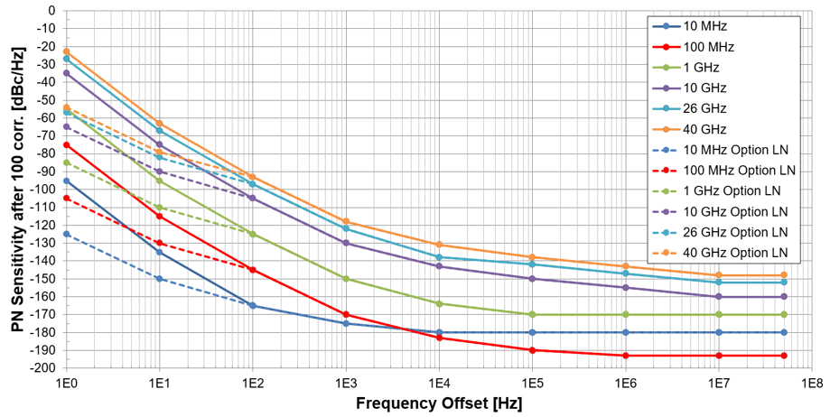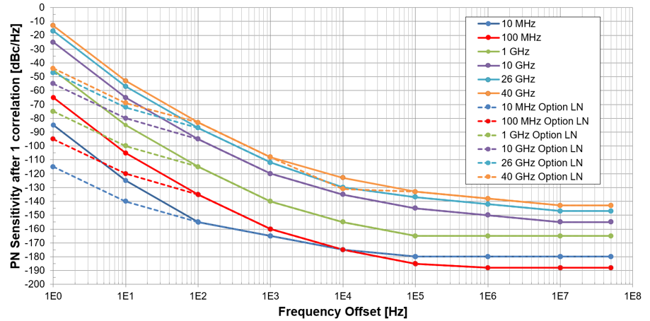 相位噪聲靈敏度:標準和低噪聲(選件LN)內部參考(100次互相關)