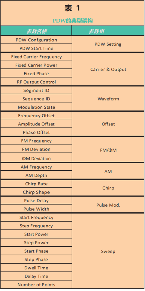 測試雷達的工程師需要能夠生成多個脈沖流,每個脈沖支持數十個參數,如頻率、幅度、相位、脈沖寬度、時間位置和脈沖內調制或啁啾。表 1 總結了描述單個雷達脈沖的典型參數集,稱為脈沖描述字(PDW)。PDW描述了一部接收機看到的每個脈沖所攜帶信息的重要特征。PDW列表將完整描述雷達脈沖流。