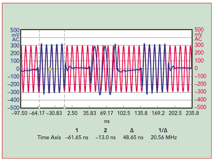 通道之間的確定性相位差對于在雷達運行期間維持角度信息至關重要。對于給定的頻率和功率設置,通道之間的相位差不會改變,即使電源電源打開和關閉也是如此。這稱為相位相干切換,如圖 5 所示。紅色正弦信號是參考通道。藍色信號切換到不同的頻率并且存在相位偏移,但是當兩個信號返回到相同的頻率設置時,藍色信號與紅色信號保持相同的相對相位。