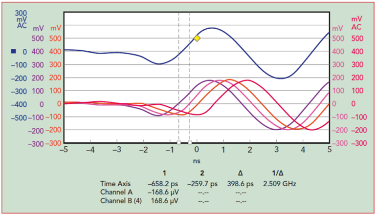 多通道APVSG在整個工作頻率范圍內支持精度高達+/-1ps RMS的精細延遲。這允許以精確的時序生成多個雷達信號流。VSG中的功能稱為時序精確的多通道觸發。獨特的延遲機制可實現這種精細的觸發延遲調整。有效分辨率是采樣時間的一小部分,通常小于1/2000。這相當于不到1ps,硬件采樣時間為2ns。圖 6 顯示了精細延遲設置功能。